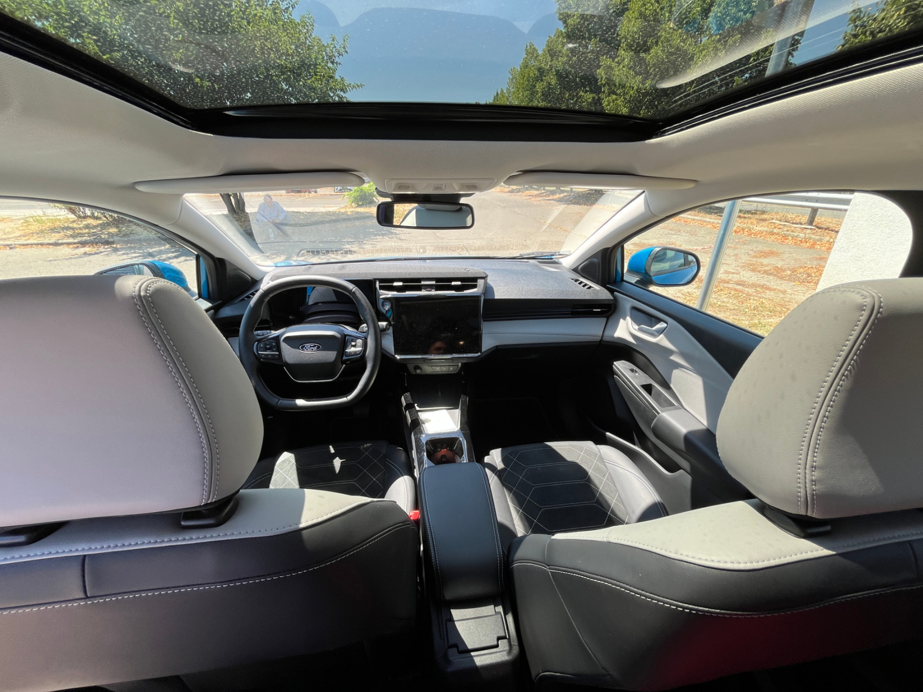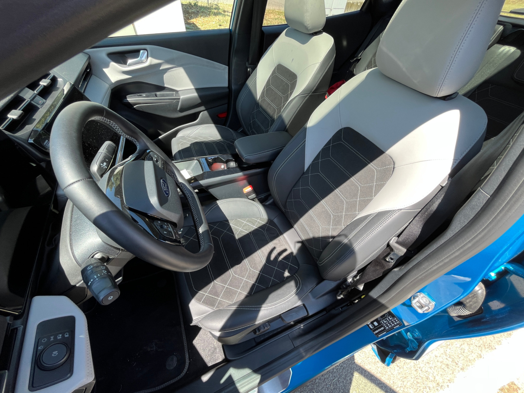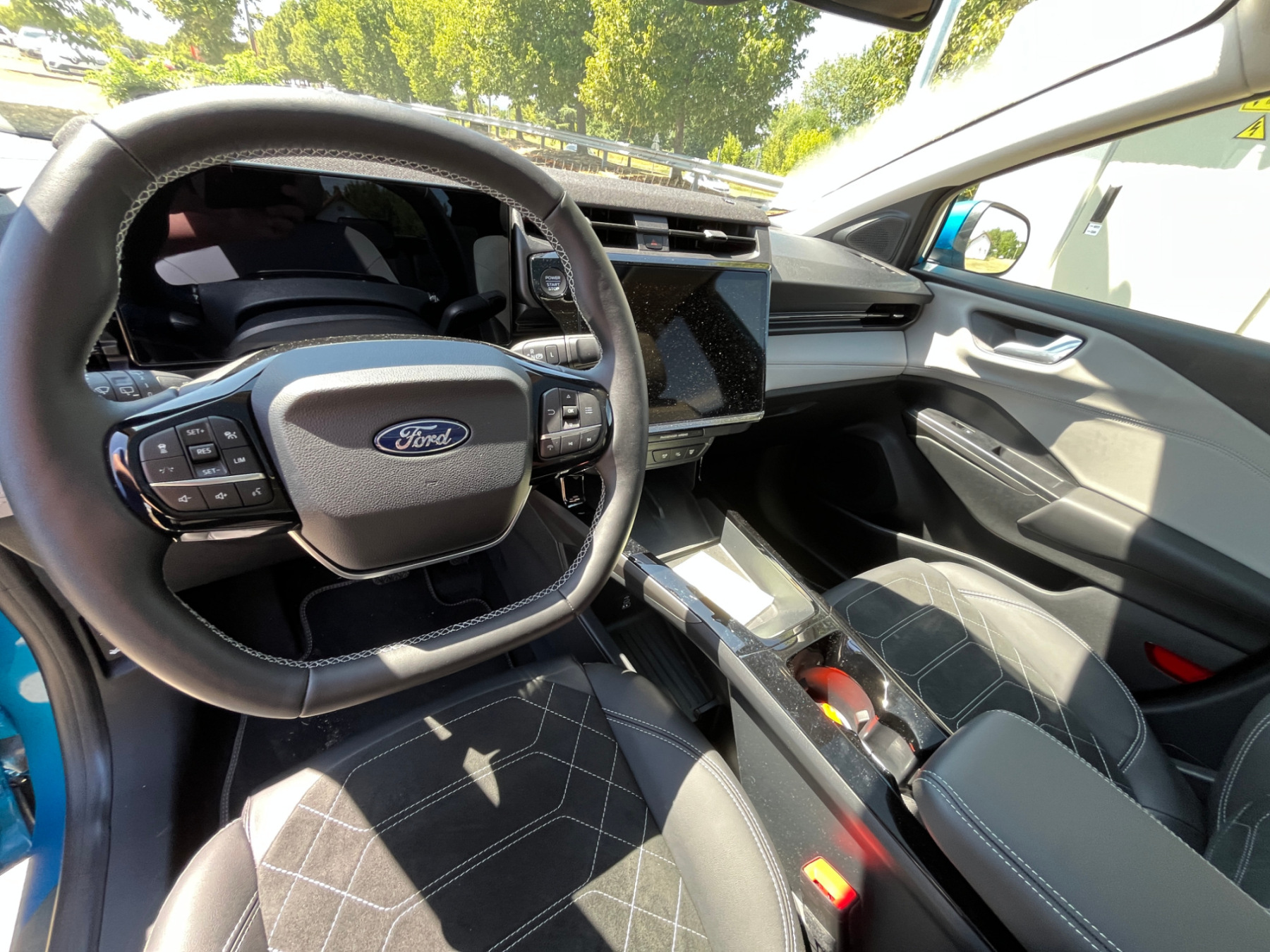 A szögletes, meglepően nagy kormánykerék, a 12,9 colos digitális műszeregység, a 12 colos érintőképernyős infotainment, valamint a Sync 4 szoftver mind a modern Ford-vonalat képviselik. A beltér nemcsak látványos, hanem kényelmesen tágas is. És jó geg, hogy a küszöbön például ott van a cica, ahogy az esti díszfény is kivetíti a logót a földre, és a kulcson is visszaköszön a motívum.