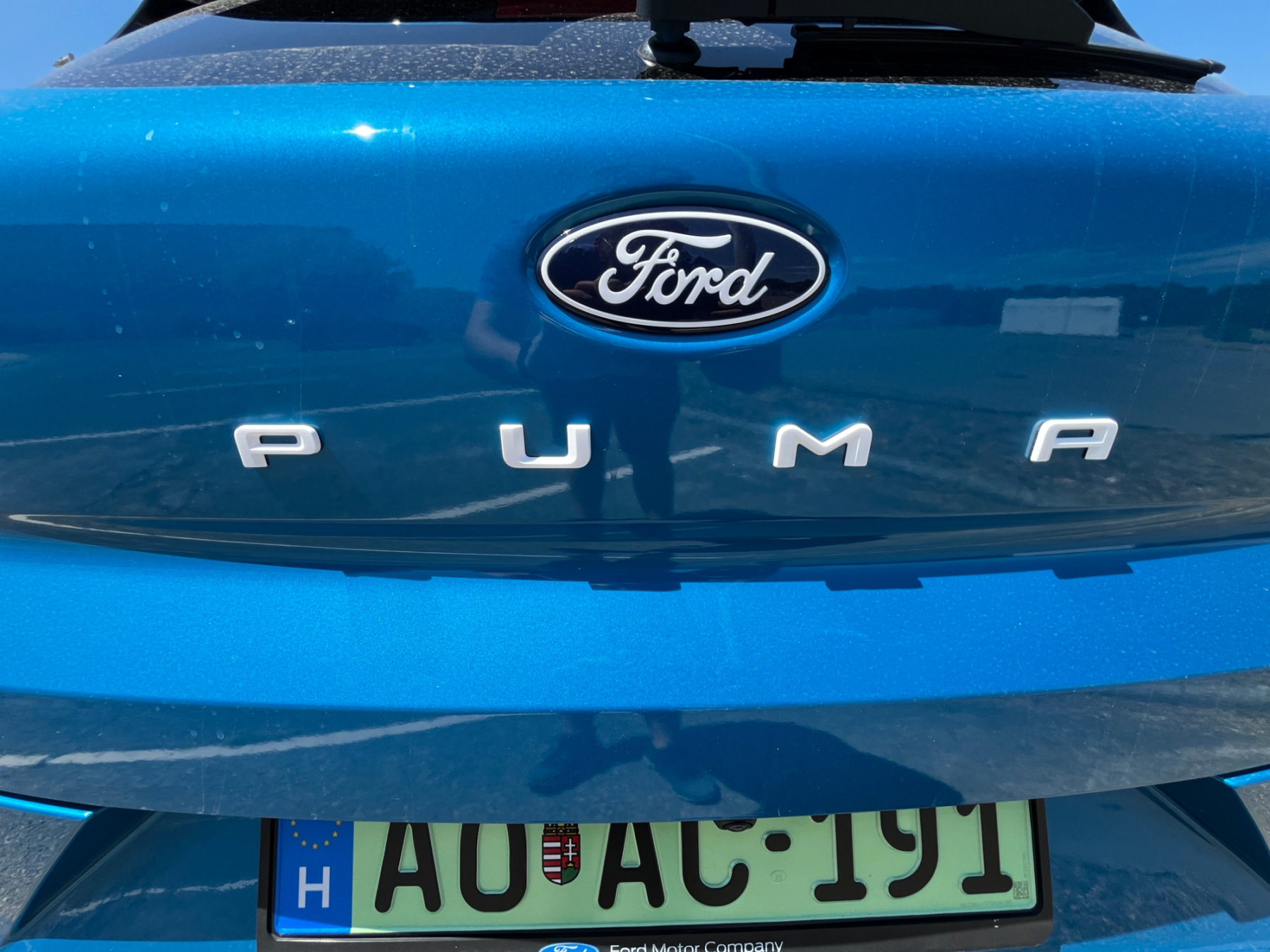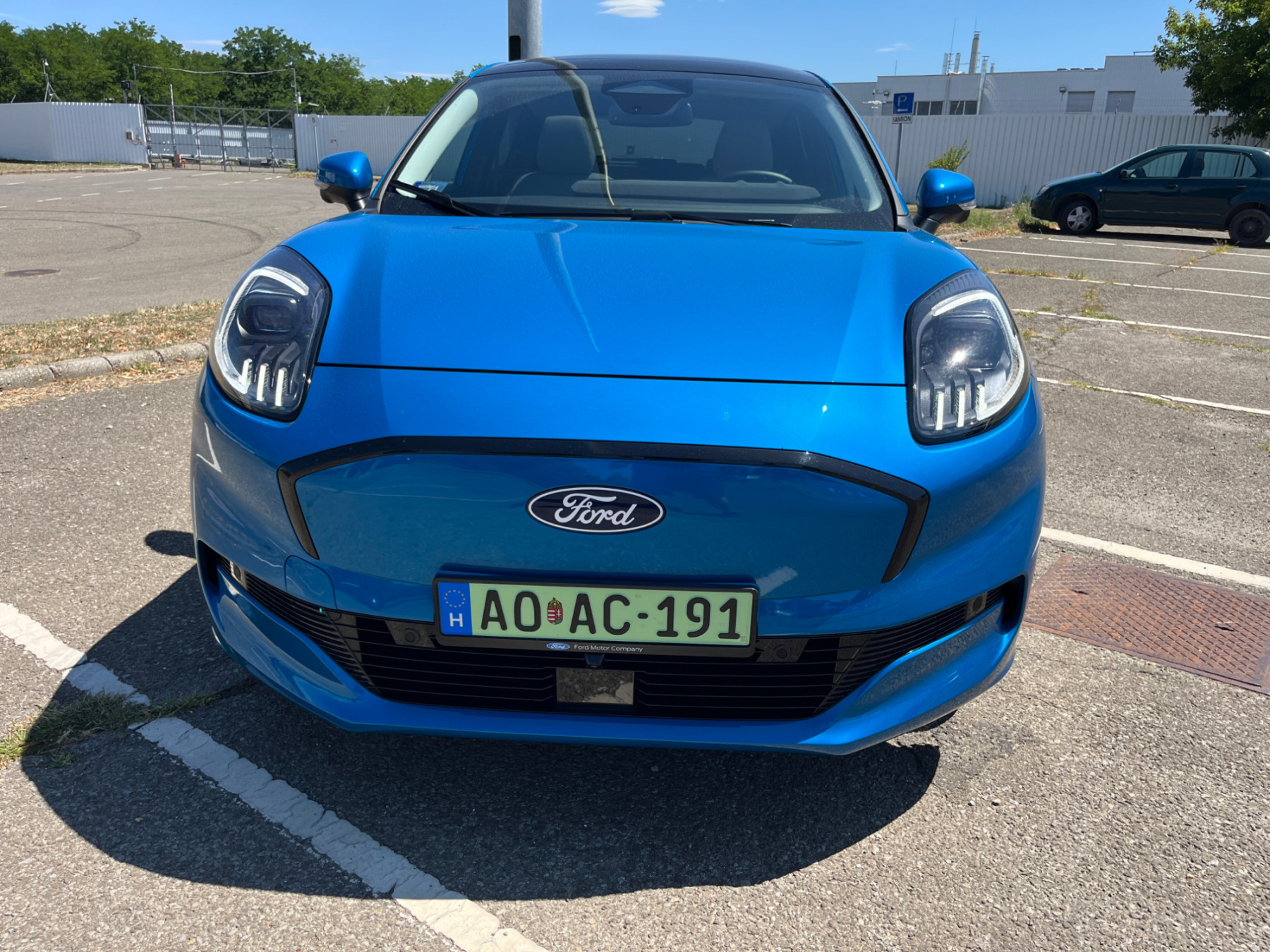 Itt lép színre tesztalanyunk, a Ford legújabb elektromos típusa, a minden eddiginél kisebb és megfizethetőbb Puma Gen-E. Maga a dizájn nem újkeletű, hagyományos erőforrással szerelt Pumákkal már évek óta találkozhatunk az utcán, a Gen-E pedig a tavaly bemutatott, ráncfelvarrott modellre épül. A zöld rendszám mellett az különbözteti meg a hagyományos modellektől, hogy a hűtőrácsát teljesen lefedték, és a lökhárítókat is egy kicsit módosították az elektromos verzión - és hátul is fehérek a típusjelzés betűi, erről is fel lehet ismerni.