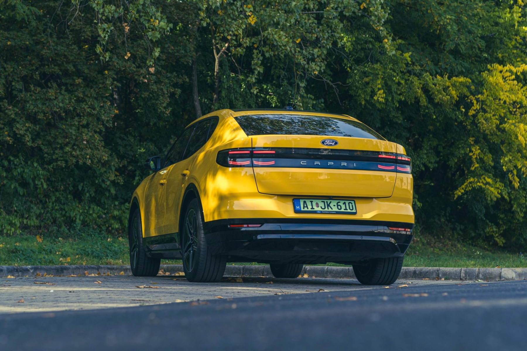 A platform olyannyira közös, hogy a Capri és az Exploler műszaki adataiban nagyítóval kell keresni a különbséget. Mi most az előbbit az Extended Range verzióban teszteltük, amelynek akkupakkja 77 kWh-s. Szerencsére a Ford is elengedte a fekete-fehér vonalat az alapszínek tekintetében: a Kuga zöldje például kifejezetten szép, de a Capri sárgája is egyesek szerint - köztük vagyok én is - elég ütős, de voltak, akik taxinak csúfolták... Ők vegyék akkor a fehéret! Hiába a közös platform, azért sikerült a VW-termékektől valami merőben mást ráépíteni, a hosszú motortér és a megnyújtott kupéforma nyomokban emlékeztet a régi, legendás kocsira.