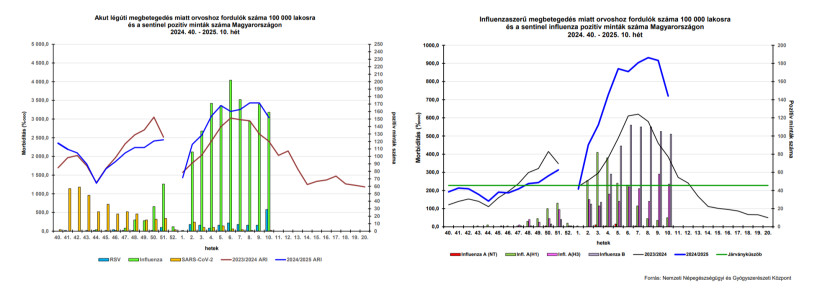A 2024. év 40. és 2025. év 10. hete között összesen 7 320 vizsgálati anyagot dolgoztak fel az NNGYK Nemzeti Influenza Referencia Laboratóriumban, ahol 1 204 főnél influenza A [638 influenza A(H1pdm09), 557 influenza A(H3), 9 influenza A(NT)], 919 főnél influenza B fertőzést igazoltak. 228 főnél RSV, 118 főnél HMPV, 523 főnél COVID-19 fertőzést diagnosztizáltak. Hatvan megbetegedés hátterében rhinovírus állt, hat megbetegedést parainfluenza, ötöt adenovírus, négyet bocavírus okozott.