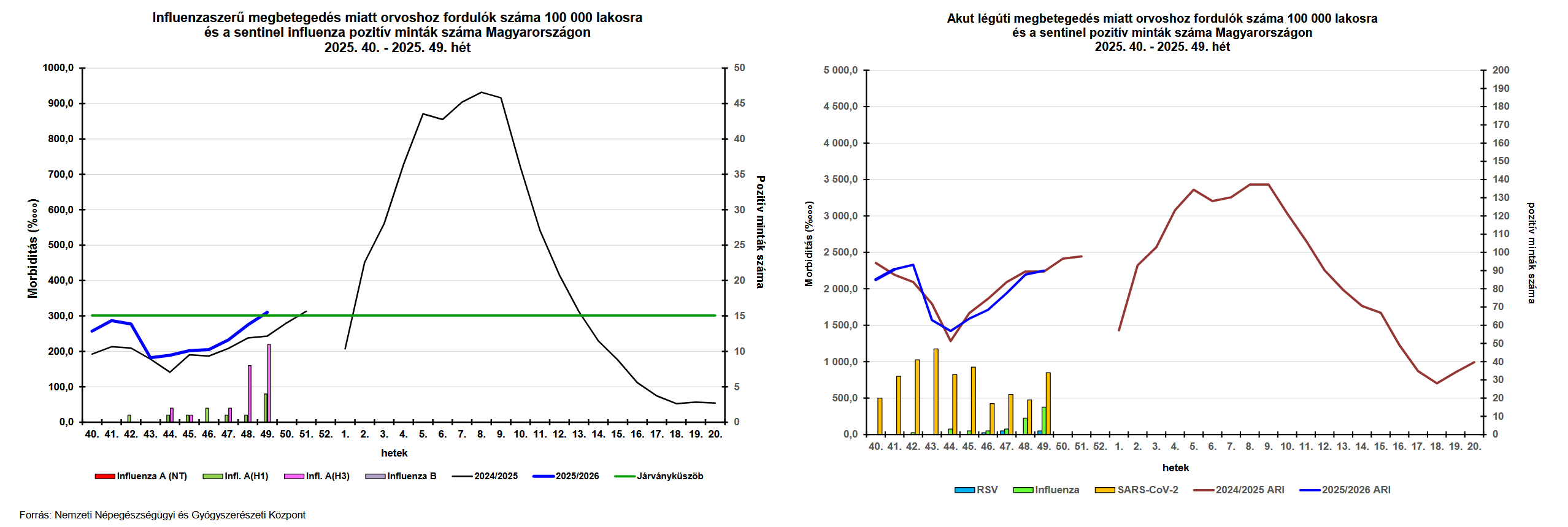 A 2025. év 40. és 49. hete között összesen 1 867 vizsgálati anyag érkezett az NNGYK Nemzeti Influenza Referencia Laboratóriumban, melyből négy feldolgozásra alkalmatlan volt. Negyvennégy főnél influenza A [16 influenza A(H1pdm09), 28 influenza A(H3)], 9 főnél RSV, 362 főnél COVID-19 fertőzést igazoltak. Huszonkilenc megbetegedés hátterében rhinovírus állt, hatot parainfluenza vírus, kettőt bocavírus, egyet adenovírus okozott.