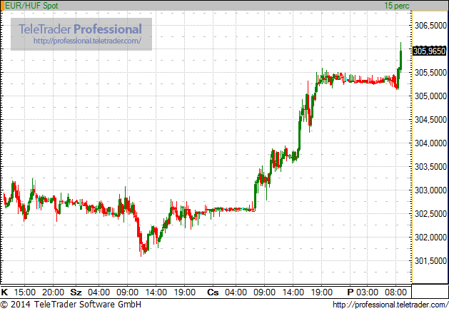 Folytatódik a forint vesszőfutása: az euró jegyzései az utóbbi percekben átlépték a 306-os szintet is.