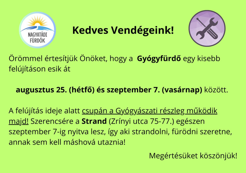 A termalonline.hu beszámolója szerint a gyógyfürdő felújítása augusztus 25-én kezdődik, és körülbelül két hétig tart majd. Ebben az időszakban a strandfürdő nem üzemel, azonban a gyógyászati részleg továbbra is működik, biztosítva a pihenni és gyógyulni vágyók számára a szolgáltatásokat.