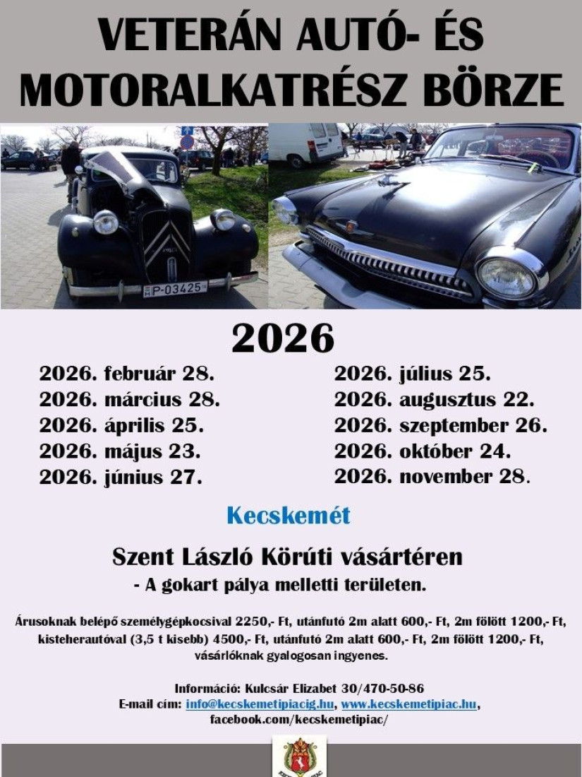 A Veterán Autó- és Motoralkatrész Börze alkalmával pedig az oldtimerek tulajdonosait és a ritkaságok iránt érdeklődőket várják. A helyszín szintén a Szent László körúti vásártér: az árusok a Gokart pálya melletti területen kínálják majd a régi gépjárművekhez való alkatrészeket. A veterán autó-és motor alkatrész börze minden hónap második felében, egy szombati napon kerül megrendezésre, az alábbi naptári rend szerint: