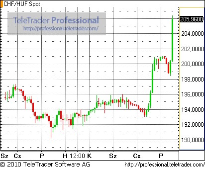A forinttal szemben is látványos erősödésbe kezdett a frank, a jegyzések már a 206-os szint felett járnak.