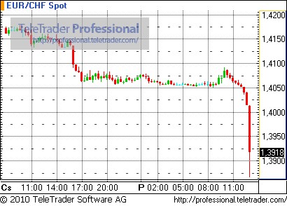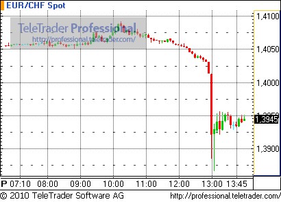 Elesett a kritikus szint az EUR/CHF árfolyam esetében, az elmúlt hetekben ugyanis a svájci jegybank (SNB) folyamatosan jelen volt és az 1.40-es szintnél beavatkozott a frank gyengítése érdekében. Devizapiaci kereskedők beszámolója szerint a jegybank ezúttal távol maradt a devizapiactól és tétlenül nézte a frank szárnyalását.