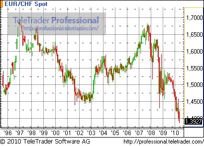 Brutális erősödésnek indult a svájci frank az euróval szemben, az alpesi deviza új történelmi csúcsra száguldott. A jegyzések már az 1.39-es szint alatt járnak, amire soha nem volt még példa. Mindeközben a nemzetközi befektetői hangulat romlásával párhuzamosan a dollár is erősödik. Hírügynökségi beszámolók szerint a globális piacok beborulását a magyarországi események (az államcsőddel kapcsolatos kijelentések) váltották ki.