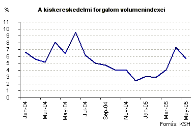 A kiskereskedelmi forgalom az első öt hónapban 4.6%-kal haladta meg az egy évvel korábbit. Az I. negyedévi stagnálást követően áprilisban és májusban jelentősebben (5%-kal) nőtt az élelmiszer- és élelmiszer jellegű vegyes kiskereskedelem értékesítése, az előző év azonos hónapjához viszonyítva.