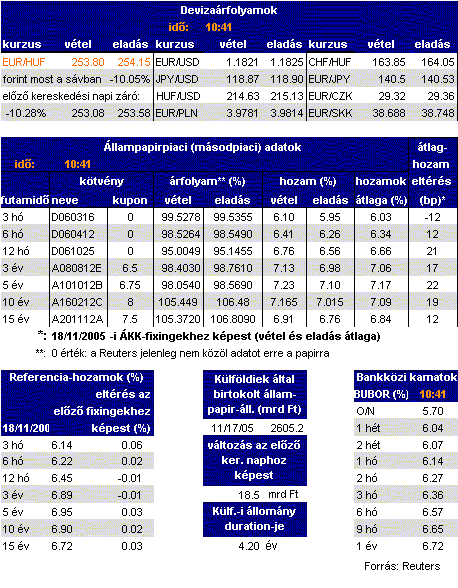 Reggel hirtelen gyengülést mutatott a forint az euróval szemben: a jegyzések a múlt pénteki 253-253.50 körüli zárószintről 254 fölé szaladtak. Kisebb korrekció után 10:41-kor 253.80-254.15-nél járt a kurzus. Az állampapírok másodpiacán a referencia-lejáratoknál jellemzően 8-15 bp-os hozamemelkedések látszanak a múlt péntek késő délutáni szintekhez viszonyítva. A magyar piac gyengülése hátterében az elhúzódó feszültségre utaló a múlt heti, illetve a hétvégi, a magyar költségvetési problémákkal kapcsolatos hírek, figyelmeztetések állnak.