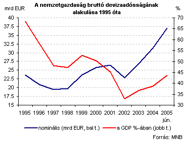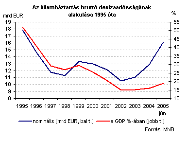 2005. június végén a nemzetgazdaság bruttó devizaadóssága 37 milliárd eurót ért el, ami 62%-kal magasabb, mint 2002. év végén (lokális mélypont). Az igen dinamikus nominális bővülés a GDP-hez mért mutatóban is jól látszik: 2002-höz képest mintegy 10%-pontos emelkedés figyelhető meg.
