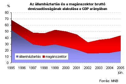 Az alábbi ábrán látható, hogy az állami devizaadósság 2002 óta bekövetkezett növekedése ellenére a GDP-hez viszonyított arányszám még mindig lényegesen alacsonyabb, mint a '90-es évekre jellemző szint. A nemzetgazdaságon belül a magánszektor devizaeladósodása még az államháztartásnál is erőteljesebben bővül.