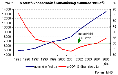 A félév végi közel 65%-os eladósodottság lényegesen eltér a kormányzati propagandában, illetve célokban szereplő 57-59% körüli szinttől (2004. év végi adat). A kettő közötti különbség döntő része abból adódik, hogy az MNB nem veszi figyelembe a magánnyugdíjpénztári korrekció lehetőségét. Ez még bő egy évig lehetővé teszi az alacsonyabb hiányszámok kimutatását, de érvelésük szerint mire az euró-bevezetés valóban reálissá válik, már régen nem számolhatunk a korrekciós segítséggel. Az alábbi ábrán jól látszik, hogy már negyedik éve folyamatosan emelkedik a bruttó konszolidált GDP-arányos államadósság.
