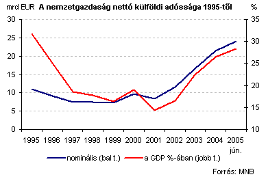 A nemzetgazdaság (azaz a válallatok, a háztartások és az állam) nettó külföldi adóssága 2005. júniusában nominálisan 24 milliárd eurót (1995-ben 11 mrd EUR), míg a GDP arányában 28.4%-ot tett ki, mely már igen közel van az 1995-ben mért 31.8%-os arányhoz. 5 év alatt mintegy 10%-ponttal nőtt ez az eladósodási kategória, ami igen figyelemre méltó és kedvezőtlen tendencia, melyben természetesen benne van az egyre inkább terjedő devizahitelezés hatása is.