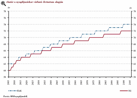 A Magyar Nemzeti Bank két szakértője által tavaly készített nyugdíjmodell egyik javaslata szerint a várható élettartam emelkedésével párhuzamosan kellene emelni a jelenlegi 62 éves nyugdíjkorhatárt. Ez a modell szerint 3 évente fél évet, azaz éppen dupla sebességet jelentene, mint a koalíciós pártok által fent jelzett ütem. Az MNB modellje szerint így 2020-ra 64-65 év, 2050-re 68-69 év lenne a törvényes nyugdíjkorhatár a nők, illetve a férfiak számára.