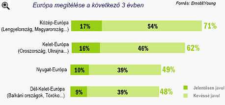 Ráadásul az öreg kontinens kilátásait illetően Közép-Európával kapcsolatosan a legoptimistábbak a cégvezetők. A következő három évben a befektetők több mint kétharmada számít valamilyen mértékű javulásra a régióban.