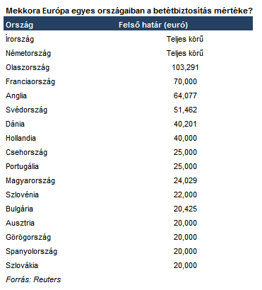 Az európai országok közül az előző héten Írország és most hétvégén Németország is bejelentette, hogy teljes körű garanciát vállalnak a lakossági bankszámlákra, miközben Ausztria is ezt tervezi, azonban csak az Ecofin tanácskozása után mondják ki a végső döntést. Most hétfőn a svéd kormány jelentette be, hogy az eddigi 250,000 svéd koronás betétbiztosítási határt a duplájára 500,000 koronára emelik, az angol pénzügyi felügyelet pedig 35,000 fontról 50,000 fontra emelte az állami garancia mértékét, ami 64,000 eurónak (12.5 millió forintnak) felel meg.