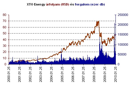 Nem túl nagy titok, hogy az energiacégek jó üzletet csináltak az elmúlt 10 év során. A folyamatosan emelkedő olaj- és energiaárak busás hasznot hoztak a társaságoknak. Az XTO mind a nyersolaj-, mind a földgázbizniszből igyekezett kivenni a részét. A társaság fő területei Kelet-Texasban és Észak-Kelet Louisianában vannak; e két területen összesen 3300-3600 potenciális fúrási pontot találtak. Az új kutak oldalán azonban valószínűleg már Exxon felirat fog virítani, mivel decemberben megállapodott a két cég az egyesülésről - mint azt a Portfolió is megírta. Nem csoda, hogy az Exxonnak érdeklődésével párhuzamosan a befektetők érdeklődése is megugrott, így a részvény árfolyama az elmúlt tíz év alatt csaknem hetvenszeresére nőtt.