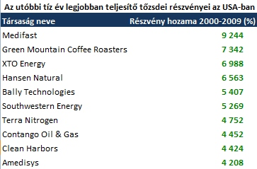 Az utóbbi tíz év ugyan hivatalosan nem számít egy évtizednek, csak az első tíz "2000-rel kezdődő évnek", de azért már javában készülnek a statisztikák. Ezen idő alatt az amerikai részvénypiacokon végigsöpört 9/11 és a nemzetközi terrorizmus fenyegető árnyéka, a Katrina-hurrikán és egy teljes pénzügyi válság, mégis jó néhány olyan részvény található a piacon, mely nem csak, hogy nem veszített értékéből, de határozottan növelte is azt. Persze ne lepődjön meg senki, hogy csak kis neveket talál rajta, melyek piaci kapitalizációja legfeljebb néhány milliárd dollár. A közgazdasági tanulmányainkból még emlékezhetünk: a kis sztárok és kérdőjelek produkálják a legnagyobb növekedést, aki azonban erre 10 évig képes, az biztosan nem az utóbbi csoportba tartozik.