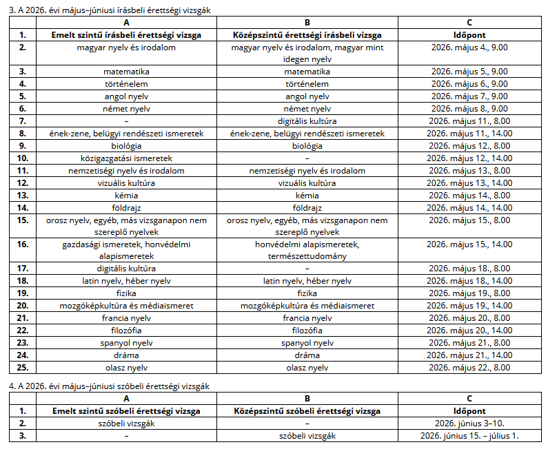 A 2026. évi május–júniusi írásbeli érettségi vizsgák magyar nyelv és irodalom, illetve magyar mint idegen nyelv tantárgyakkal kezdődnek 2026. május 4-én, 9.00 órakor. Az emelt szintű és középszintű írásbeli érettségi vizsgák az olasz nyelv tantárggyal zárulnak május 22-én.