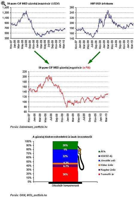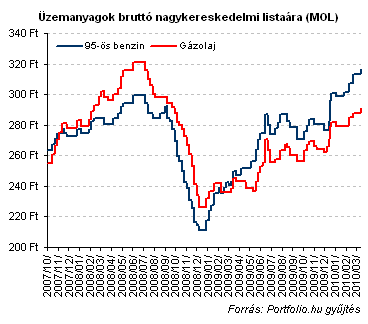 Szerdán (2010. március 31-én) nulla órától 3 forinttal emeli a MOL a benzin nagykereskedelmi listaárát, miközben a gázolaj ára szintén 3 forinttal kúszik feljebb - tudta meg a Portfolio.hu. Ez azt jelenti, hogy az olajcég a benzin literjét a kiskereskedőknek listaáron bruttó 316.5 forintért, a gázolajat pedig bruttó 290.9 forintért adja majd.