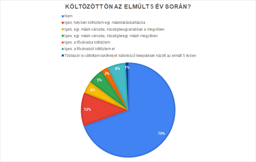 Az alábbi grafikonon látható, hogy a legtöbb válaszadónk nem költözött a közelmúltban. Azok, akik mégis, főként helyben költöztek (12%), mások a fővárosból költöztek el (6%), miközben kevesen költöztek közülük Budapestre (2%). A többször lakóhelyet váltók száma is szinte elenyésző volt (1%).
