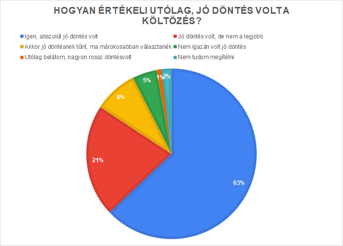 Arra is kíváncsiak voltunk, hogy akik költöztek, nem bánták-e meg a döntésüket. Az derült ki, hogy 63% teljesen elégedett a döntésével utólag is, 21% már nem tartja a legjobb döntésnek, de még mindig elégedett. A válaszadók 8%-a ma már okosabban döntene, viszont mindössze 1% érezte úgy, hogy nagyon rossz döntést hozott: