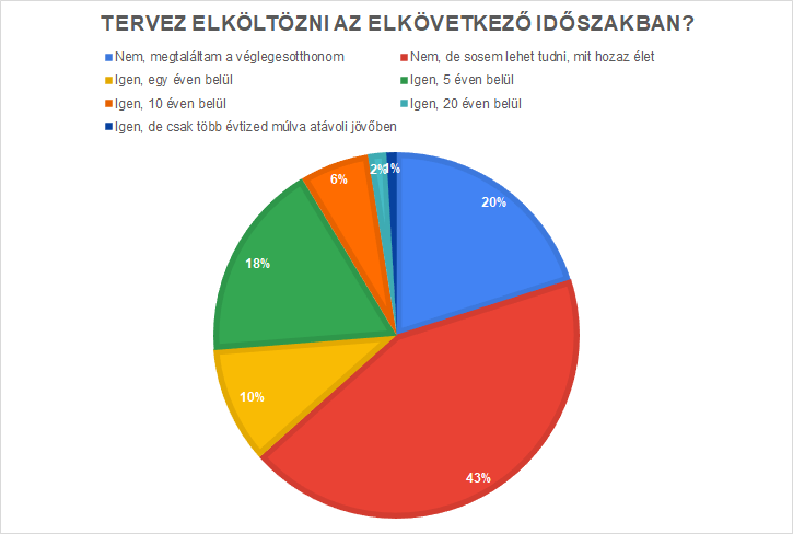 A kérdéssor arra is kitért, hogy terveznek-e válaszadóink költözést. 20% már megtalálta a végleges otthonát, így nincs a pakliban sem a költözés, és még 43% sem tervez elköltözni, csak esetleg, ha úgy hozza az élet a jövőben, amit most még nem lehet kiszámítani. Viszont 1 éven belül a válaszadók 10%, öt éven belül pedig 18% tervez költözést. Hosszabb távon pedig összesen 9% gondolkodik valamilyen formában költözésben: