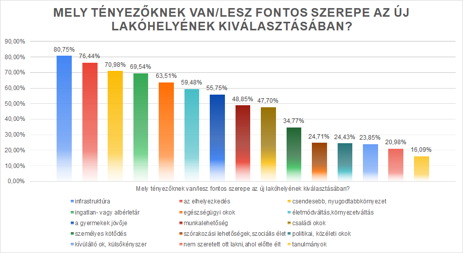 A következő kérdés csak azokhoz szólt, akik költöztek az elmúlt év során. Arra voltunk kíváncsiak, mik voltak a költözés legfőbb motiváció. Mint kiderült, az infrastruktúra rendkívül fontos szempont: a válaszadók háromnegyede jelölte nagyon fontos, vagy inkább fontos (5-ös skálás 4-es vagy 5-ös) válaszként. Szorosan a nyomában van az elhelyezkedés és csak ezt követik az ingatlanárak a fontossági sorrendben. Legkevésbé a szociális élet, a tanulmányok folytatása vagy a politikai okok játszanak szerepet az új lakóhely választásban: