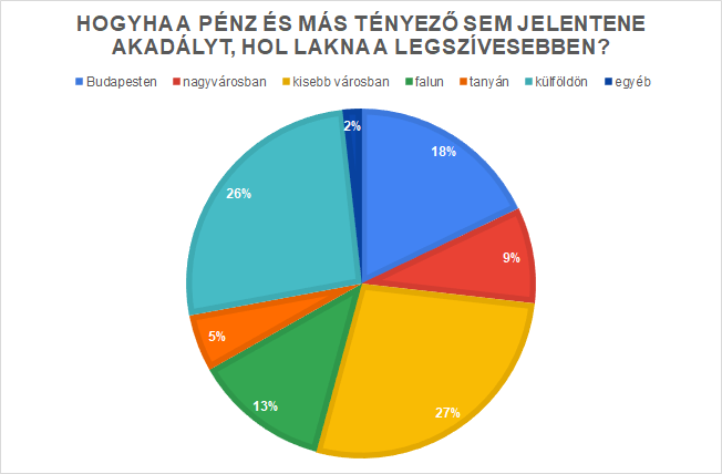 Természetesen az ember már eleve olyan lehetőségekben szokott gondolkodni költözés esetén, ami számára reális, megfizethető. Ezért azt a kérdést is feltettük, hogyha a pénz nem tényező, hová költöznének legszívesebben a válaszadók. Az derült ki, hogy hiába tűnik úgy, hogy divat a szuburbanizáció, a legtöbben városban választanának lakóhelyet, ha meg tudnák fizetni (54%). Rengetegen költöznének külföldre is, ha a pénz nem tartaná vissza őket: