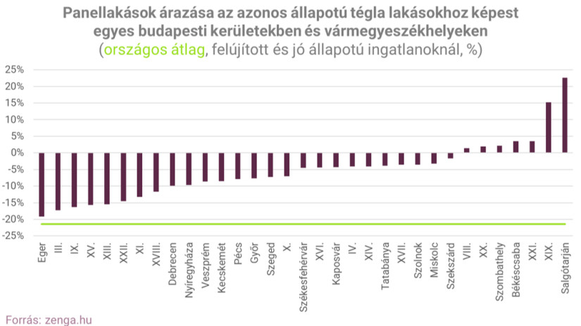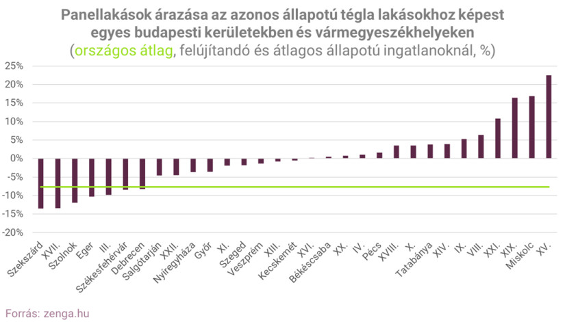Jól látszik, hogy például Miskolcon egy felújítandó panellakás négyzetméterára több mint 15 százalékkal magasabb, mint egy felújítandó tégla lakásé, Budapest XV. kerületében pedig több mint 20 százalék a panelek felára.