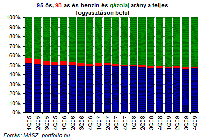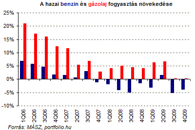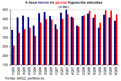 2009-ben összesen közel 3.3 milliárd liter üzemanyagot adtak el a hazai töltőállomásokon a Magyar Ásványolaj Szövetség (MÁSZ) tagjai. A negyedik negyedévben a válság ellenére a gázolajfogyasztás még mindig növekedett (igaz csak minimális mértékben), a benzinfogyasztás viszont ismét jelentős mértékben csökkent.