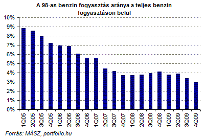 A negyedik negyedévben 30%-kal csökkent a 98-as benzin fogyasztása, a teljes fogyasztáson belül a súlya így még marginálisabb lett.