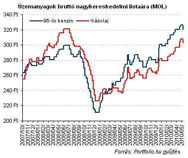 Csütörtökön (2010. május 27-én) nulla órától 6 forinttal csökkenti a MOL a benzin nagykereskedelmi listaárát, miközben a gázolaj ára 5 forinttal csúszik lejebb - tudta meg a Portfolio.hu. Ez azt jelenti, hogy az olajcég a benzin literjét a kiskereskedőknek listaáron bruttó 320.5 forintért, a gázolajat pedig bruttó 302.9 forintért adja majd.