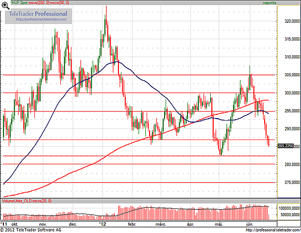 1.) Holnap az eurózóna pénzügyminiszterei várhatóan feloldják a Magyarországnak 2013-tól esedékes uniós kohéziós pénzek felfüggesztéséről szóló korábbi döntésüket. Ez elképzelhető, hogy átmeneti forinterősödést még kivált. Ennél nagyobb piaci hatása lehet annak, hogy szintén holnap külön "minicsúcsot" tartanak a német, francia, spanyol és olasz vezetők, amelyen az eurózóna válságkezelésének irányait, így például a Mario Monti olasz kormányfő által minap felvetett kötvényvásárlási lehetőséget is megvitatják. A találkozó a június 28-29-i uniós csúcstalálkozóra való felkészülést, az álláspontok közelítését is célozza, igaz a német kancellár tegnap már azt is egyértelműsítette, hogy a válságkezelő alapok (EFSF, ESM) általi, feszültségcsökkentési célú kötvényvásárlás a periféria országok piacain inkább csak elméletben létező lehetőség.