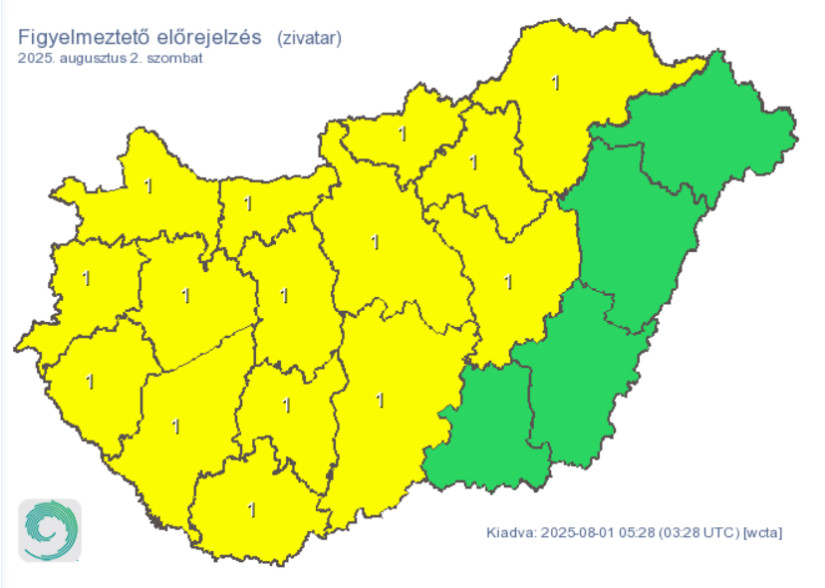 Pénteken a késő délutáni óráktól elsősorban az ország északnyugati harmadában alakulhatnak ki zivatarok. Környezetükben viharos széllökés (60-70 km/h), intenzív csapadékhullás (10-15 mm) és kisebb szemű jég (~1 cm) előfordulhat - írja a met.hu.