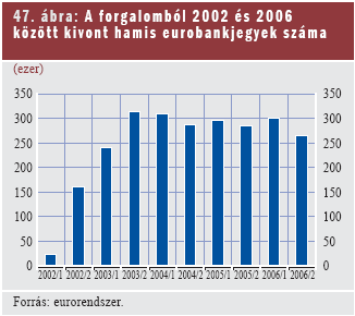 Az alábbi ábra mutatja a forgalomból kivont hamisítványok trendjét, az eurobankjegyek bevezetése óta félévenként vett számadatokkal. A nemzeti bankjegyszakértő központok17 által kapott hamisítványok száma 2006-ban összesen körülbelül 565 000 volt.