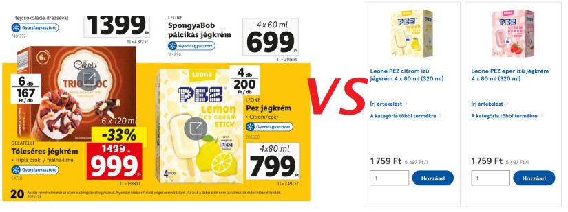 Az érintett jégrém a Leone PEZ citrom ízű jégkrém 4 x 80 ml (320 ml). A tescós termék egységára 5 497 Ft/liter, a lidlis jégkrémé 2 497 Ft/liter. A jégkrémet megtaláltuk a Tesco online rendelési felületén, illetve a Lidl június 26-tól érvényes akciós újságjában: