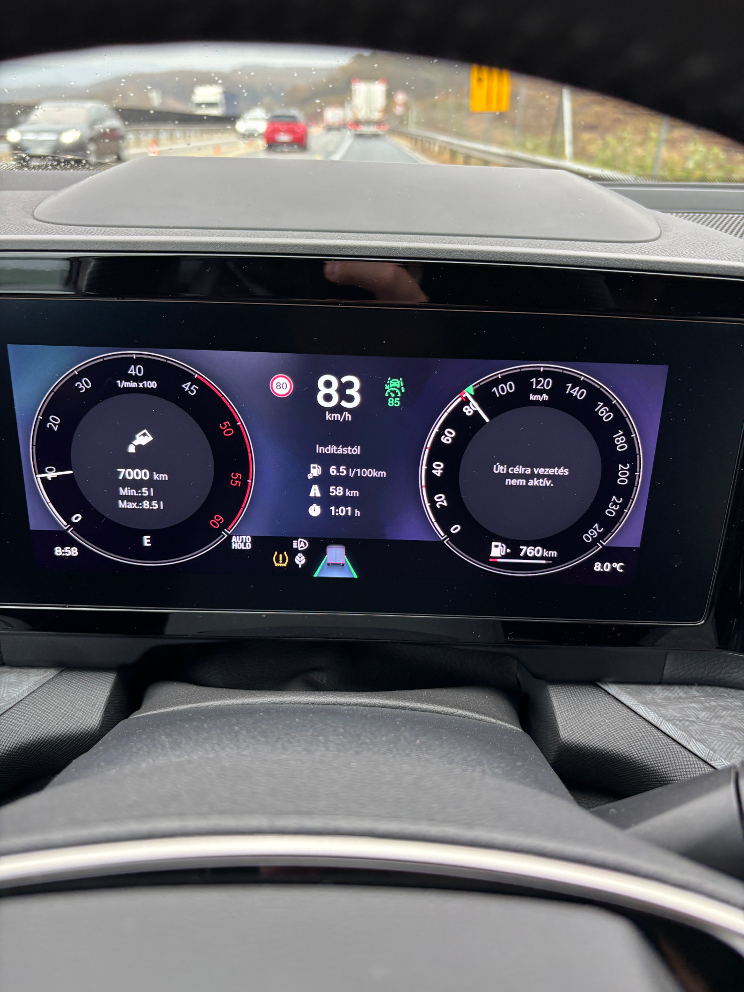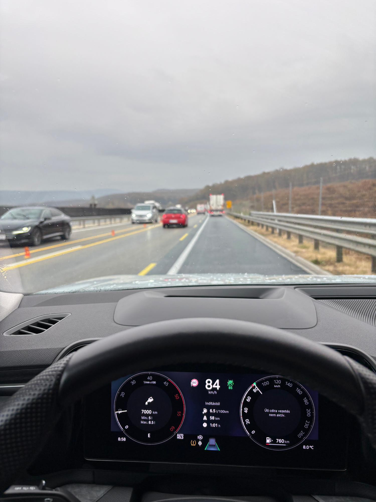 Mindez a gyakorlatban azt jelenti, hogy a sávelterelések és a sebességkorlátozások miatt az ideális körülmények között nagyjából 2 óra 20 perces útból egy szombati napon odafelé majdnem 3 óra lett, visszafelé pedig még ennél is több... Mikor este kiszálltunk a kocsiból már több mint 7 órát töltöttünk benne az óra szerint - oké, előző este megtankoltam, az vegyen el mondjuk 20 percet a "tankolás óta" kijelzett intervallumból.