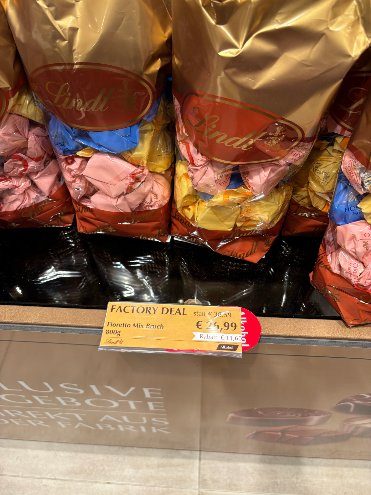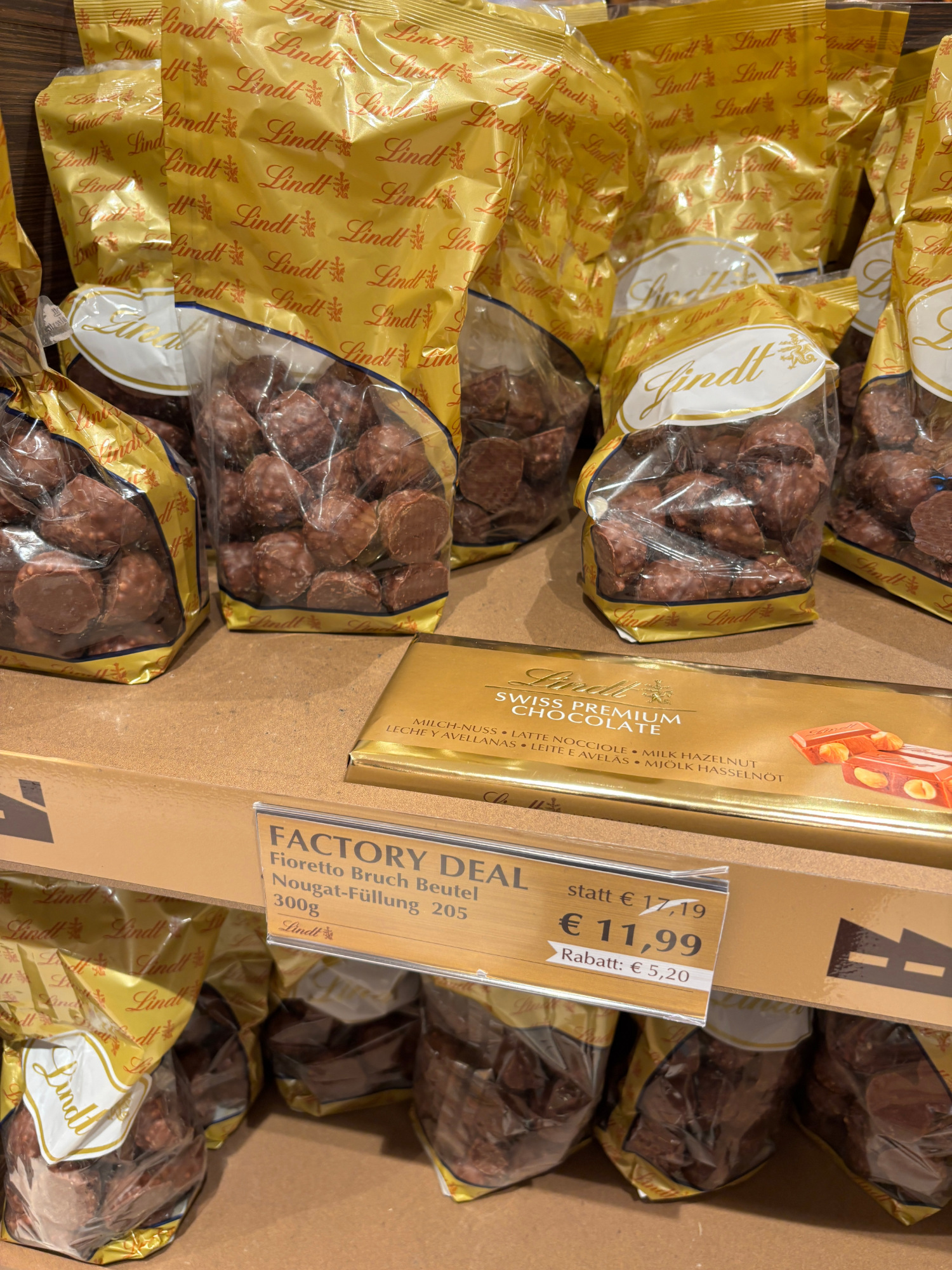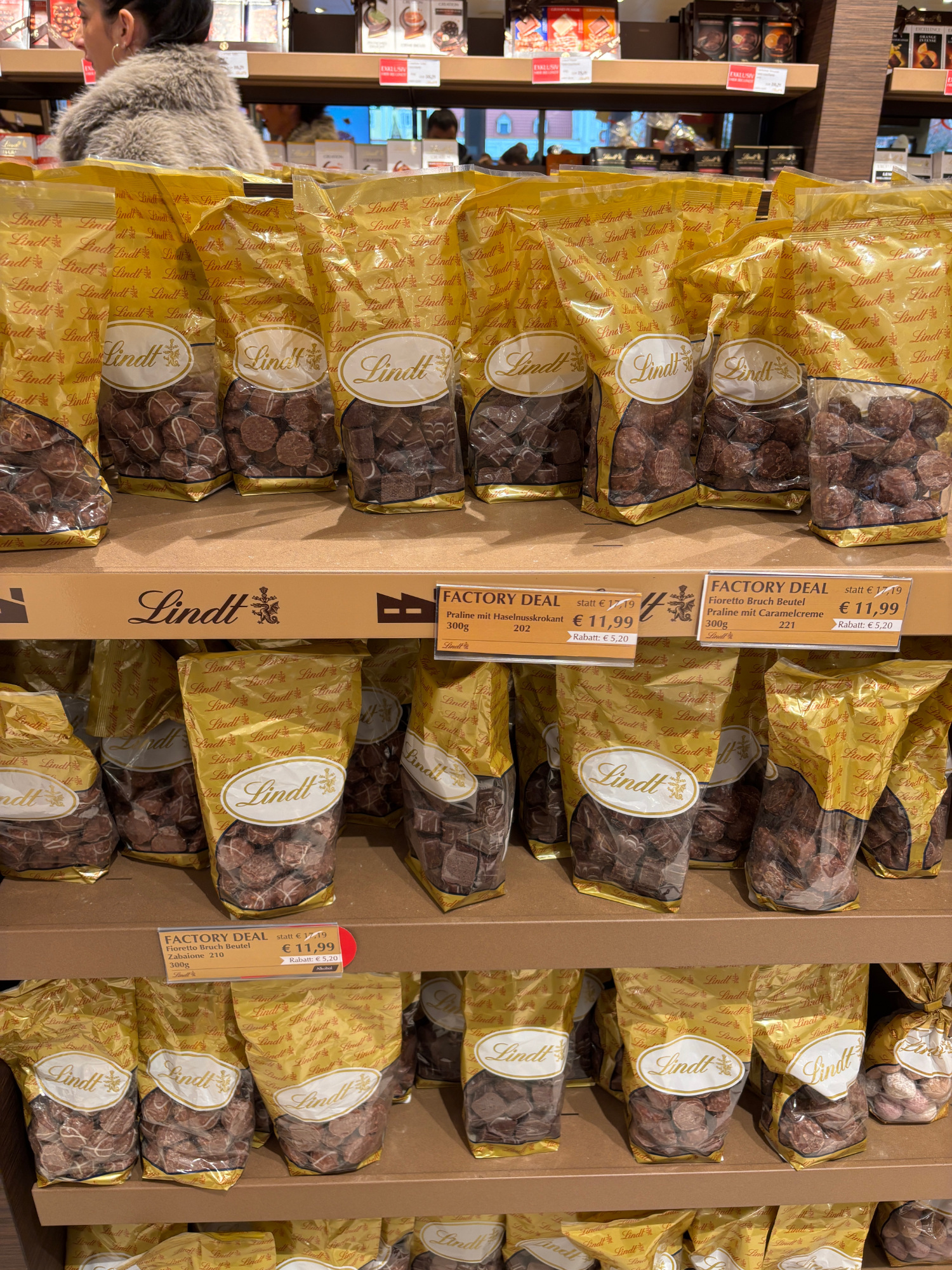 Meg persze a Lindt márkaboltban is marékszám fogytak a 100 grammonként 7,9 eurós (kb 3000 forintos) kis csokik, a 25 és 40 euró (9600 és 17 ezer forint) közötti adventi kalendáriumok, vagy a kb 4000 forintos Dubai csokik. De 10 ezer forintért lehet venni egy kiló gyártási hibás csokit is.