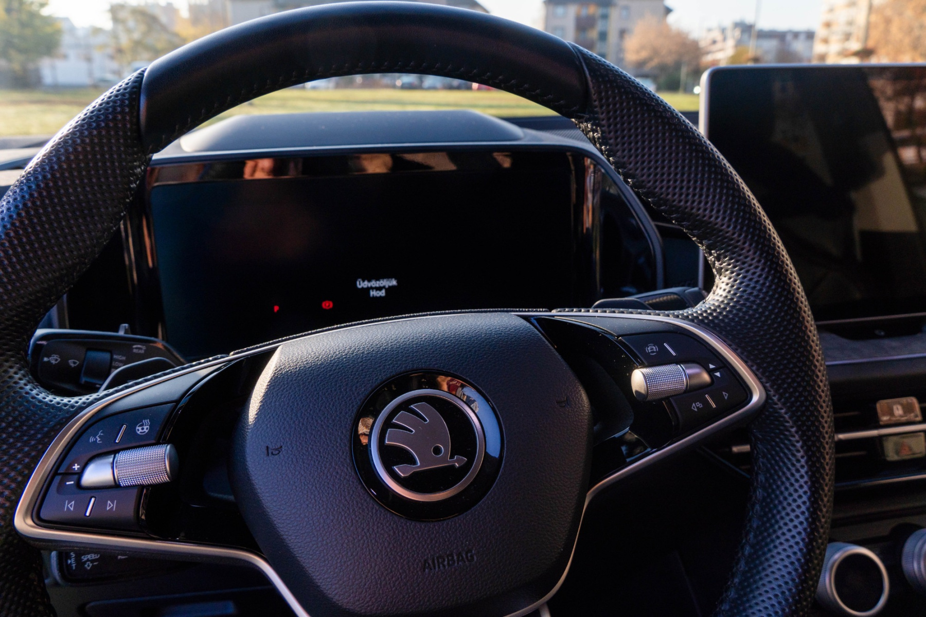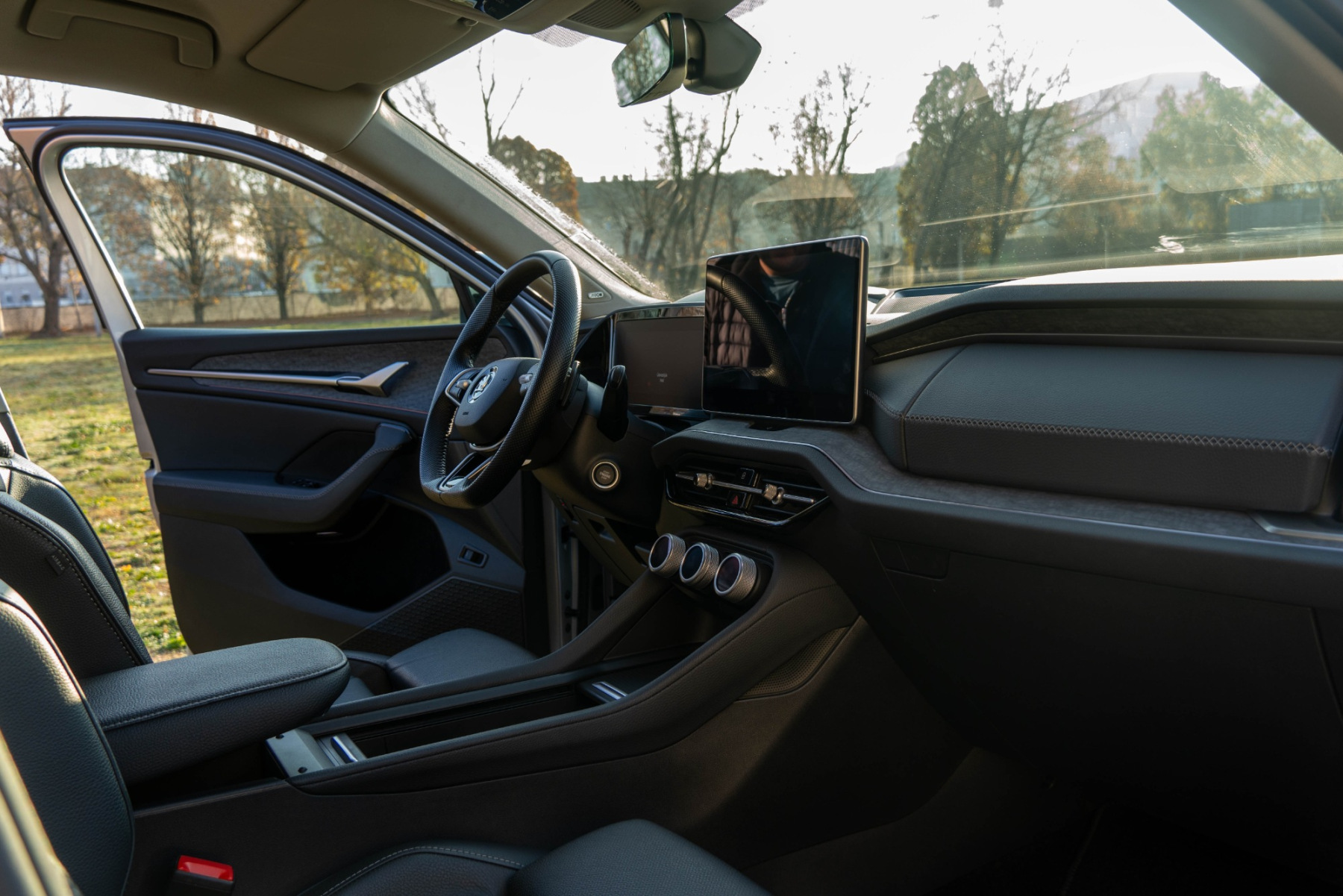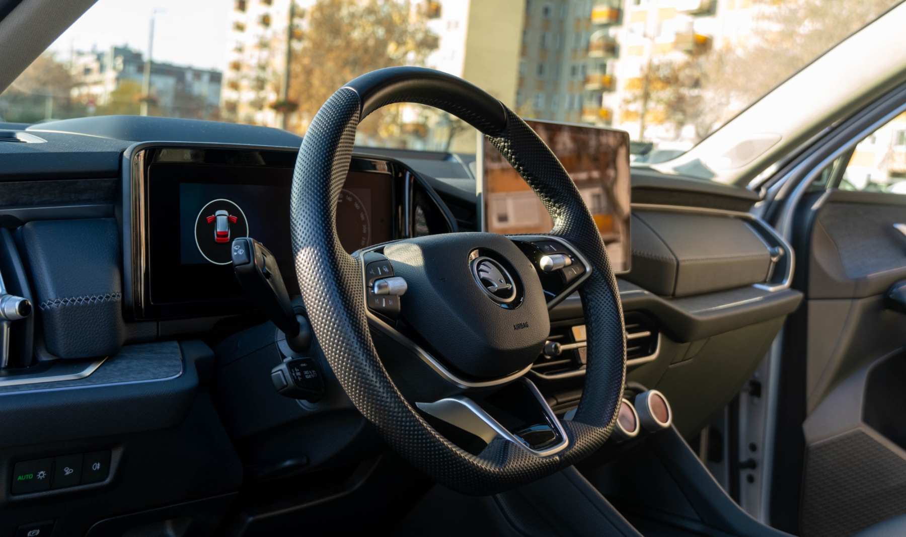 A beltér, ahogy a márkától megszoktuk, inkább funkcionális, mint látványos. A váltókar a kormány mögé költözött - ismerős lehet a Volkswagen-csoport más modelljeiból -, így a középkonzolon több hely maradt a tárolóknak és a vezeték nélküli töltőnek. A 13 colos középső kijelző menürendszere gyors és jól átlátható, a klímakonzol három nagy tekerőgombja pedig kellemes kivétel a mai érintőfelületes trendben - ráadásul mindegyik gomb saját kijelzőt kapott, és több funkció között is váltani tud, így a klímaállítás mellett menetmódok között is lehet váltani, és az ülésfűtés-szellőztetés kapcsolása is innen működik. A belső anyagok között megjelentek az újrahasznosított textilek, a márkára jellemző, ajtóba rejtett esernyő és a tanksapkánál elhelyezett jégkaparó is ezekből készül.
